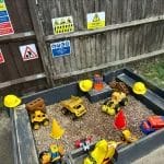 We have a large beautiful outside space with a range of soft surfaces, a small woodland, and a mud kitchen.