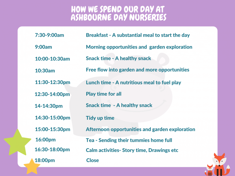 Below is an example of how we spend our day at Ashbourne Day Nurseries, please note nurseries and the dedicated rooms within them may differ